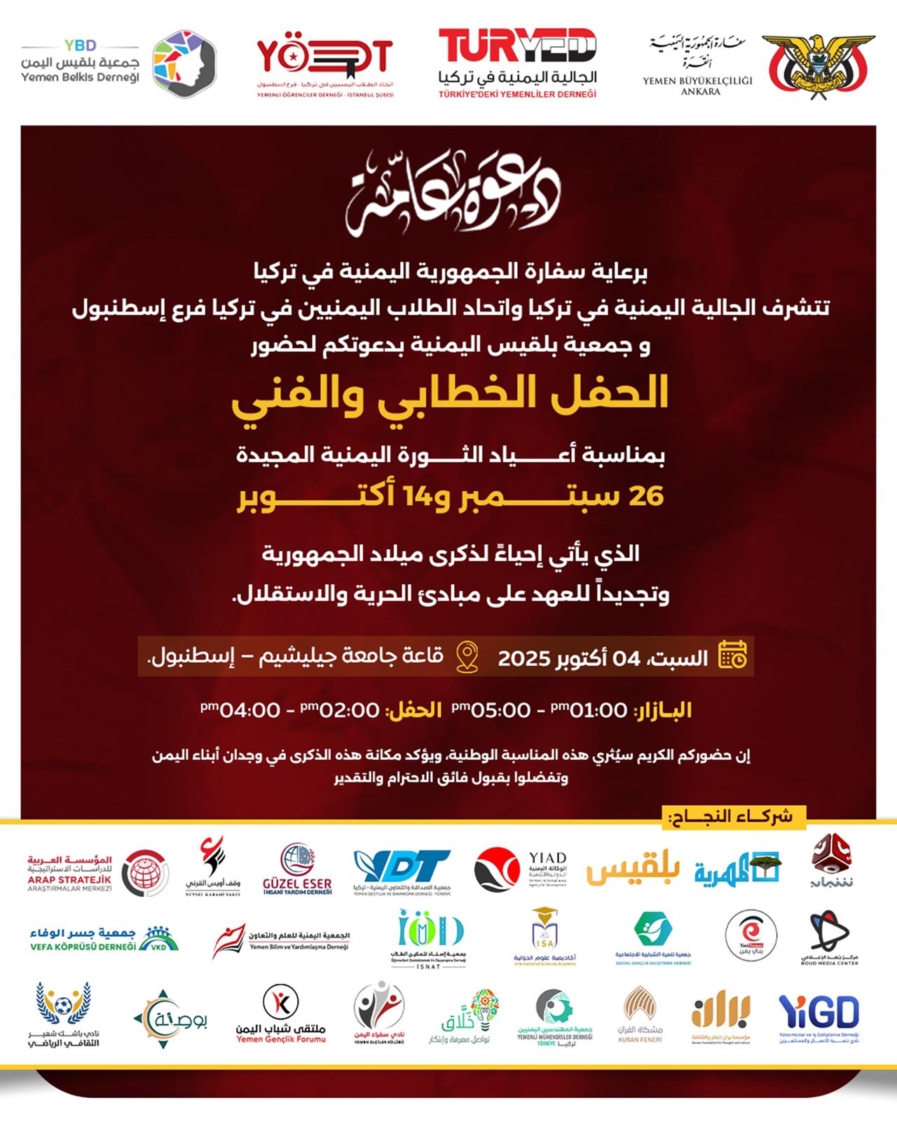 برعاية سفارة الجمهورية اليمنية في تركيا، وبدعوة من الجالية اليمنية، اتحاد الطلاب اليمنيين في تركيا – فرع إسطنبول، وجمعية بلقيس اليمنية، ندعوكم لحضور:
